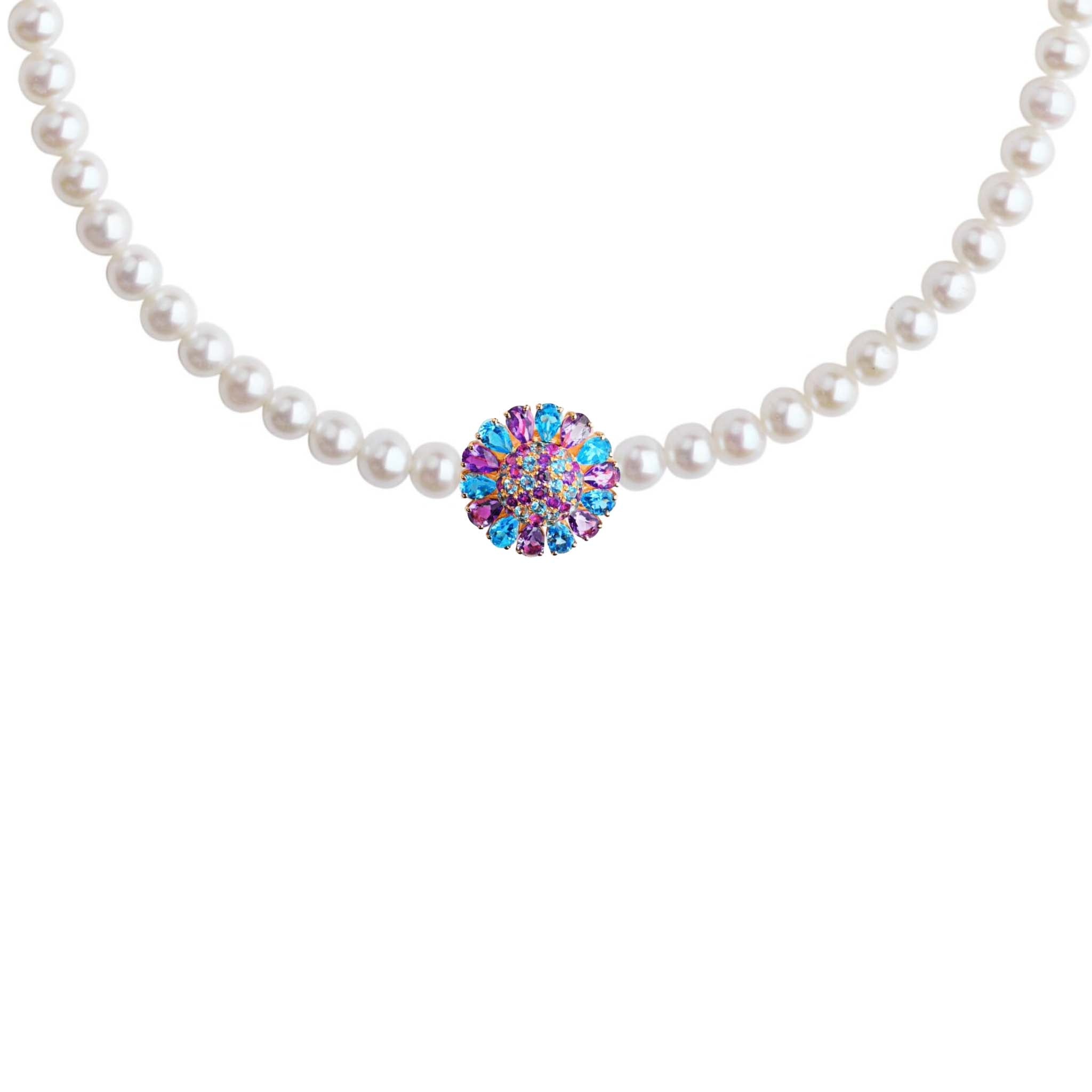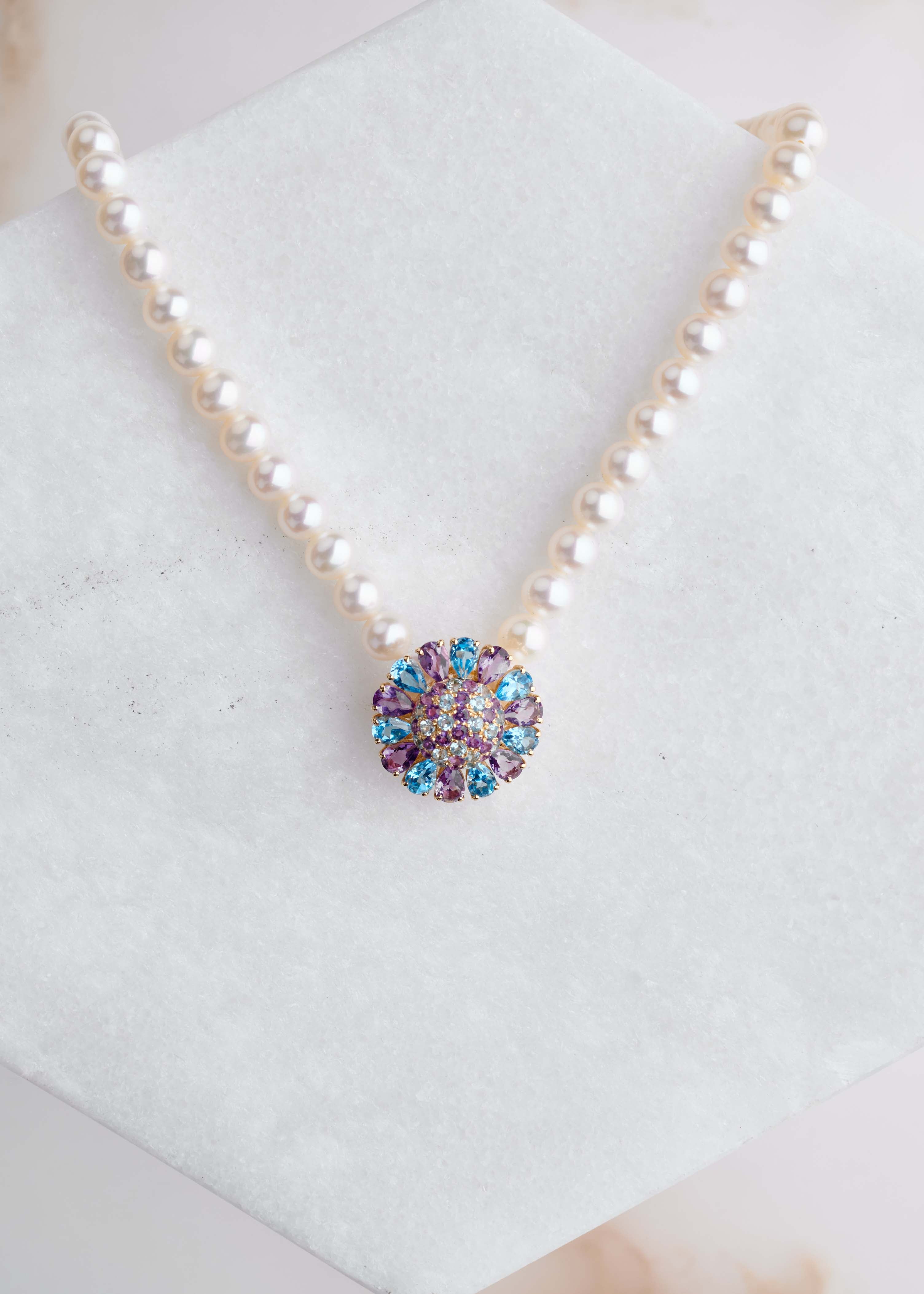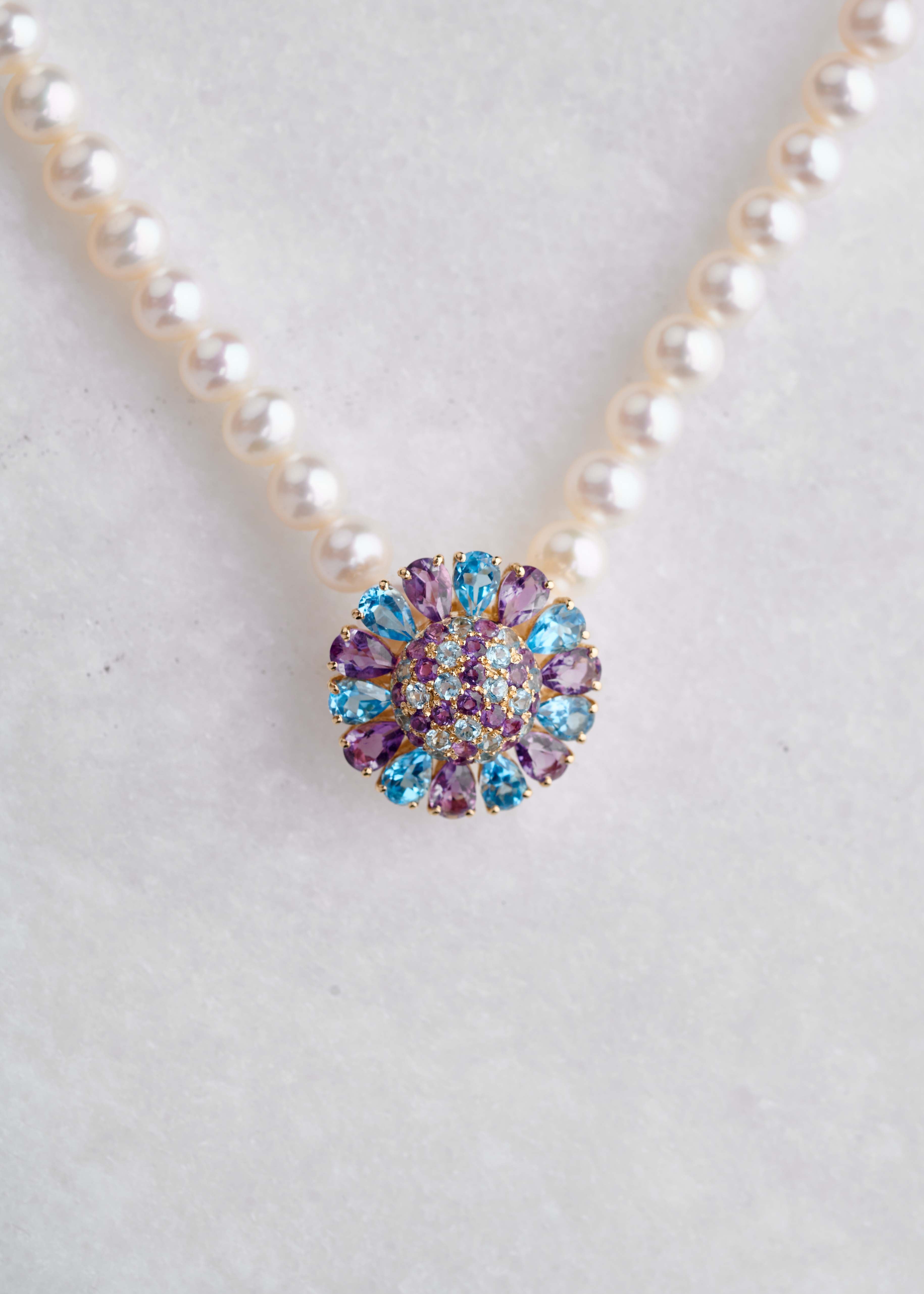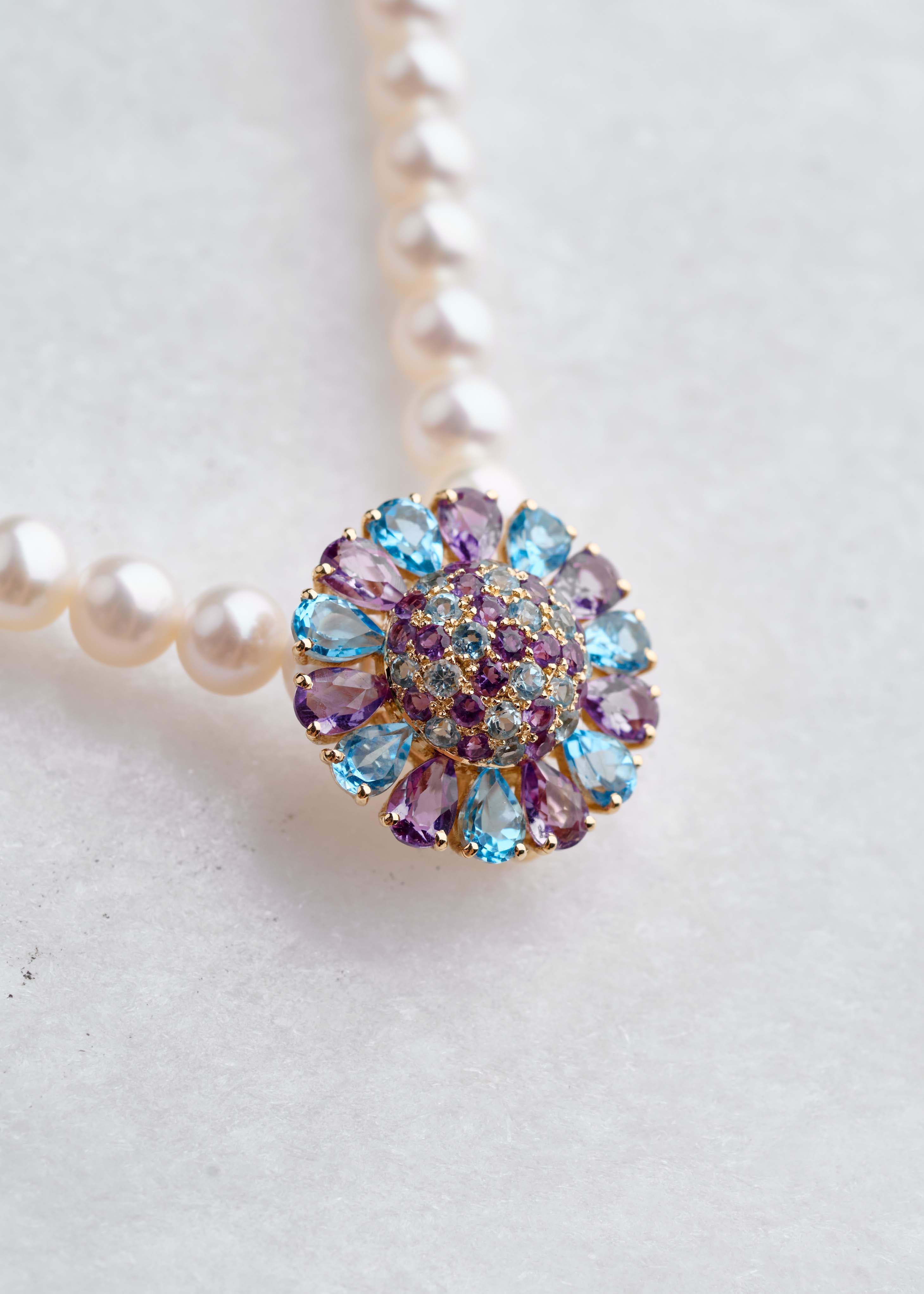 18K yellow gold choker with fresh water pearls, amethyst and blue topaz stones.