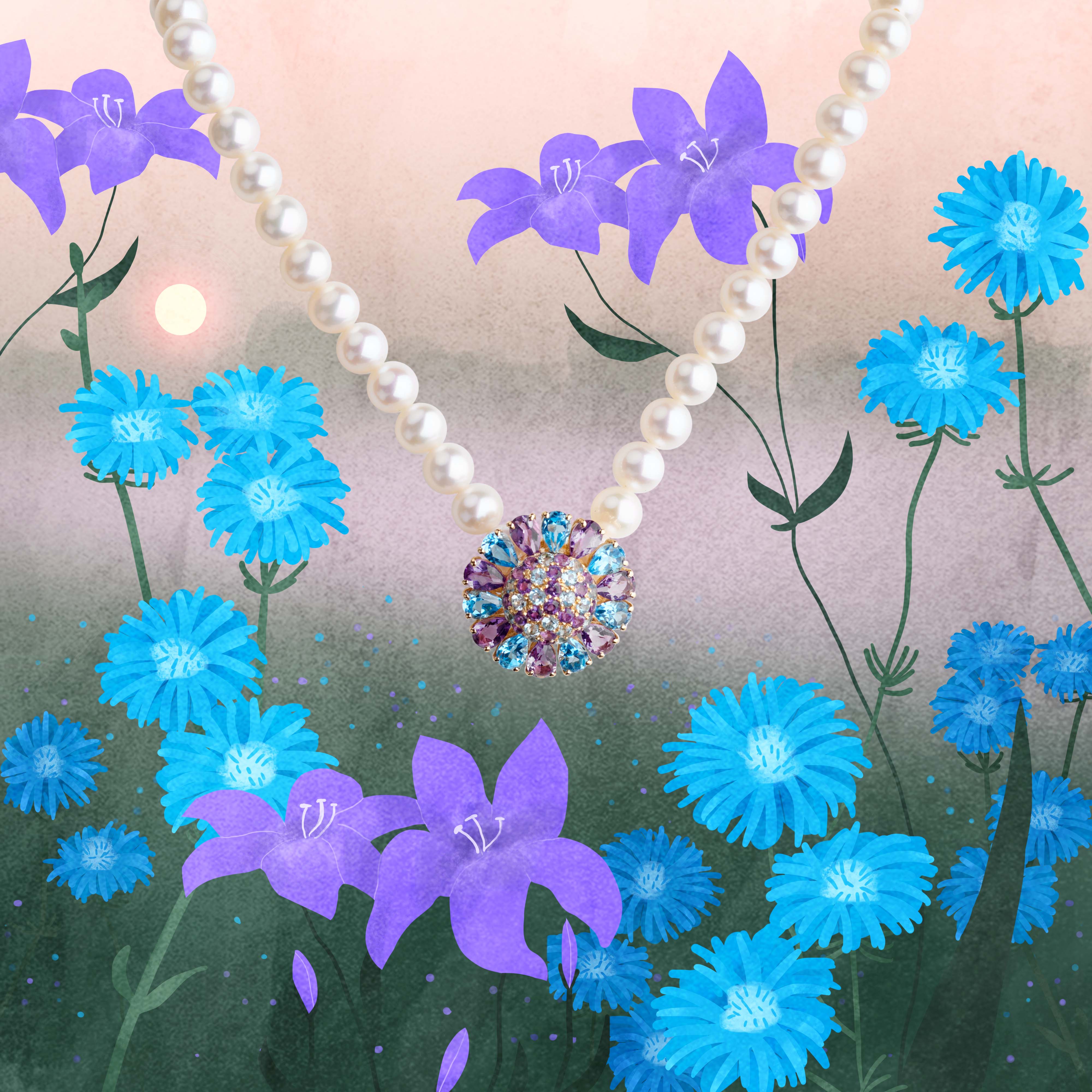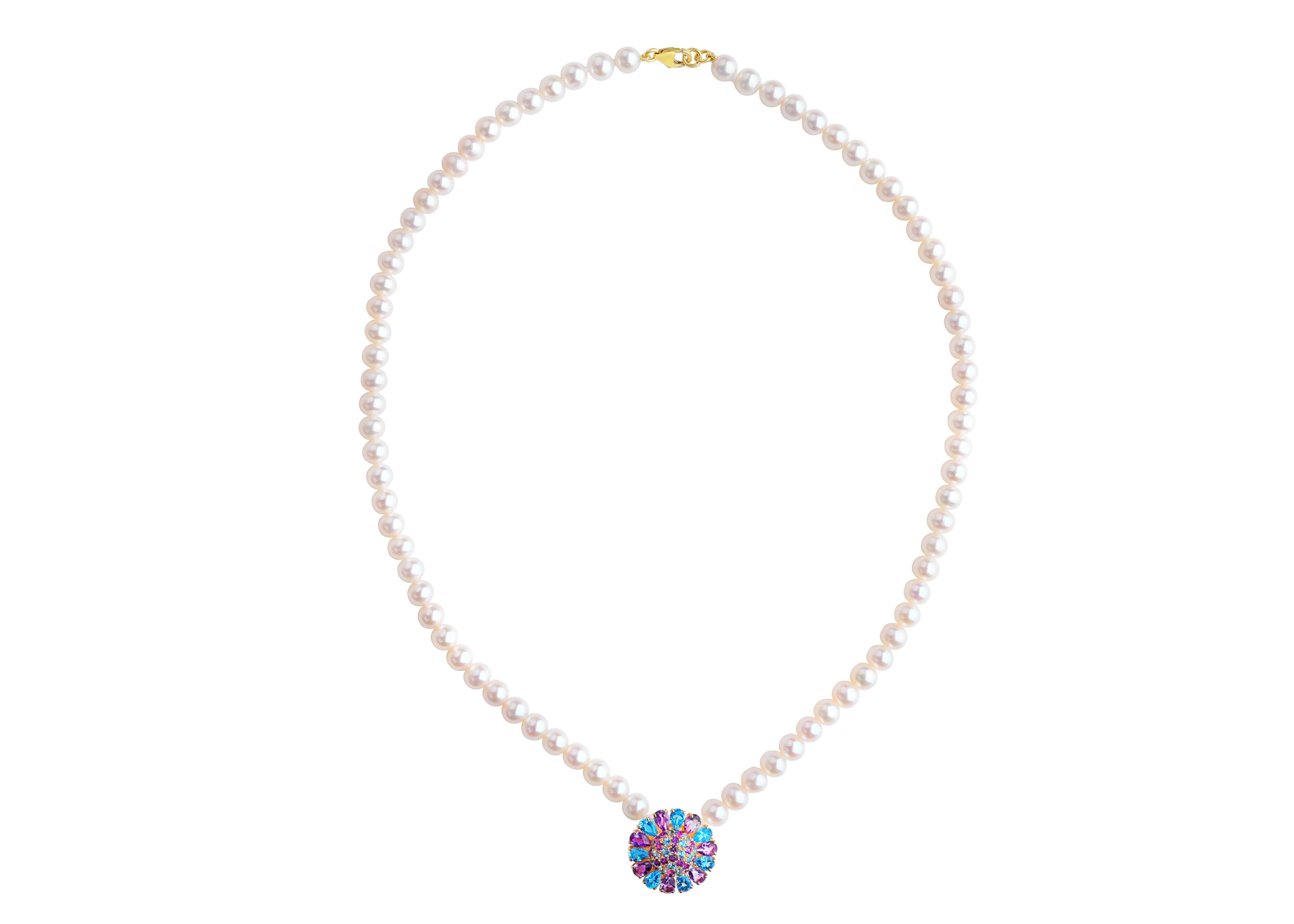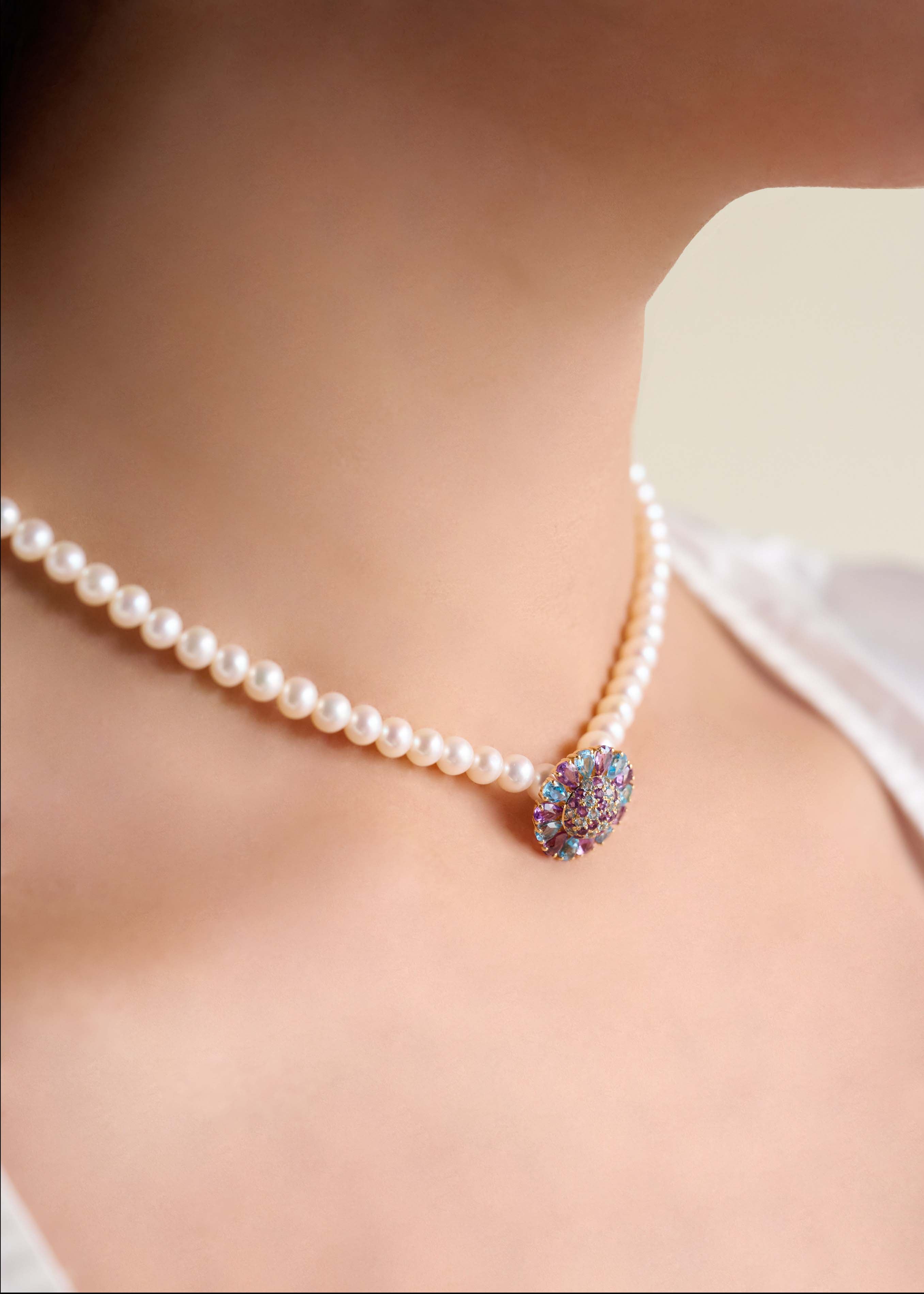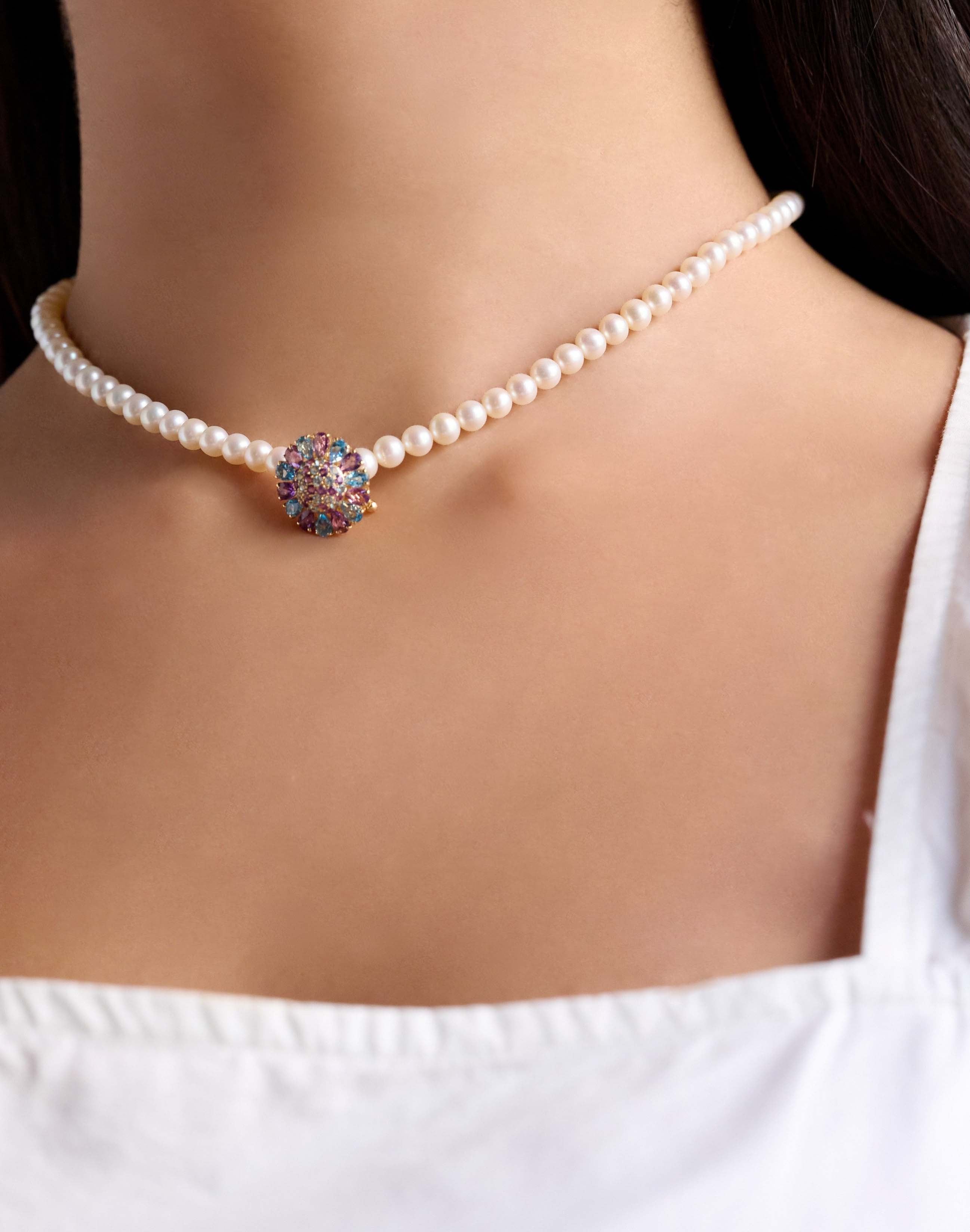 18K yellow gold choker with fresh water pearls, amethyst and blue topaz stones.