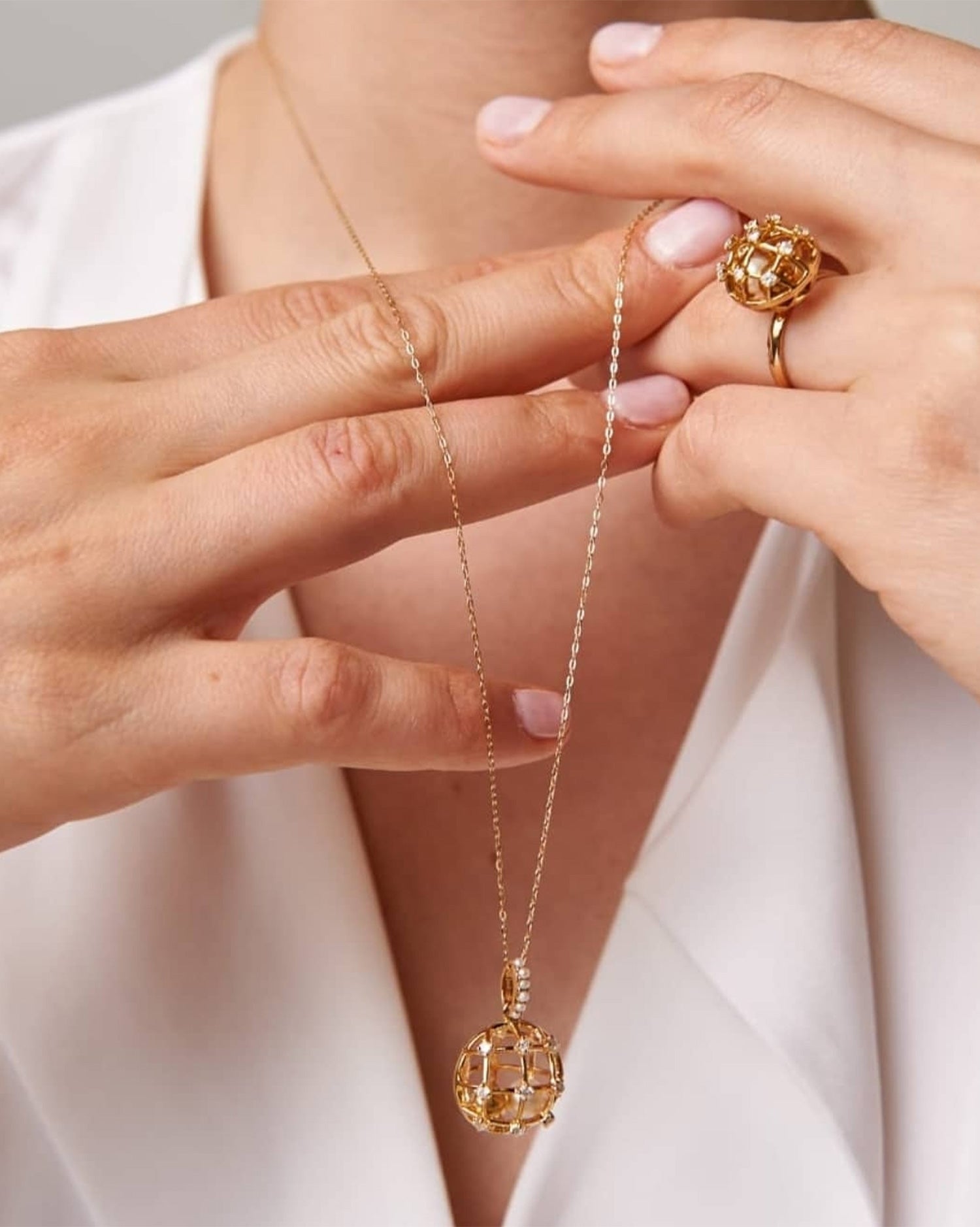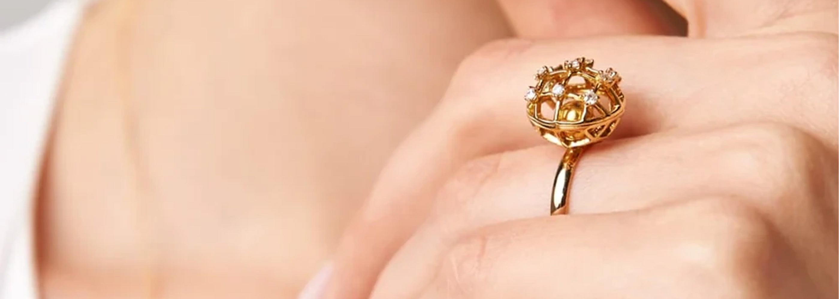 The 18k Gold Cage Jewellery Collection features luxury jewellery pieces studded with diamonds, each enclosing a single gold bead and a pearl. Trapped within the golden cage, the pearl moves freely like a tiny ball, adding a playful yet elegant touch to the design. This fine jewellery collection beautifully blends luxury, motion, and timeless elegance, where yellow gold, diamonds, and pearls come together in perfect harmony.