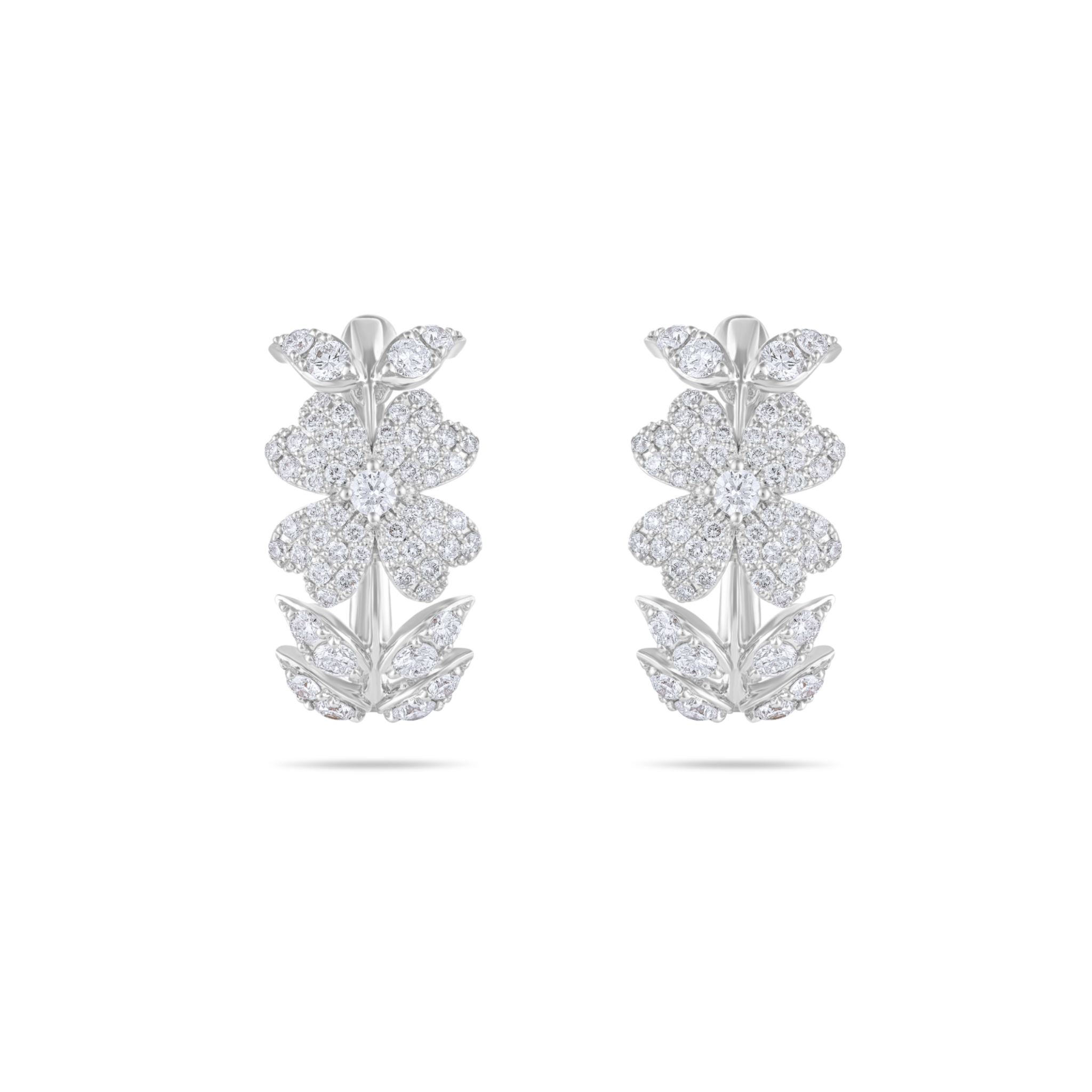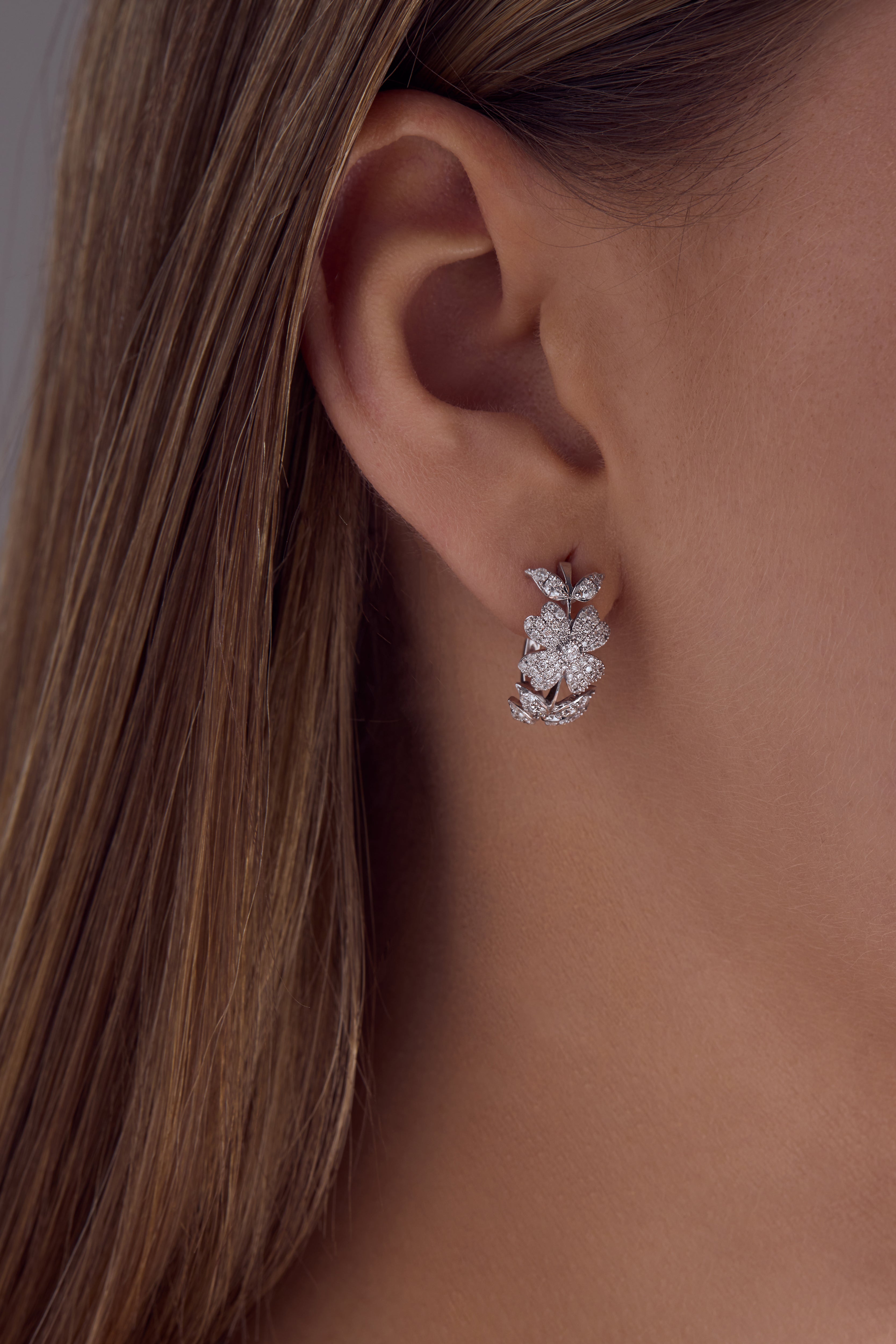 18K white gold earrings featuring a primrose flower and leaves with a frosted icy appearance beautifully set with diamonds, inspired by the beauty of Winter.