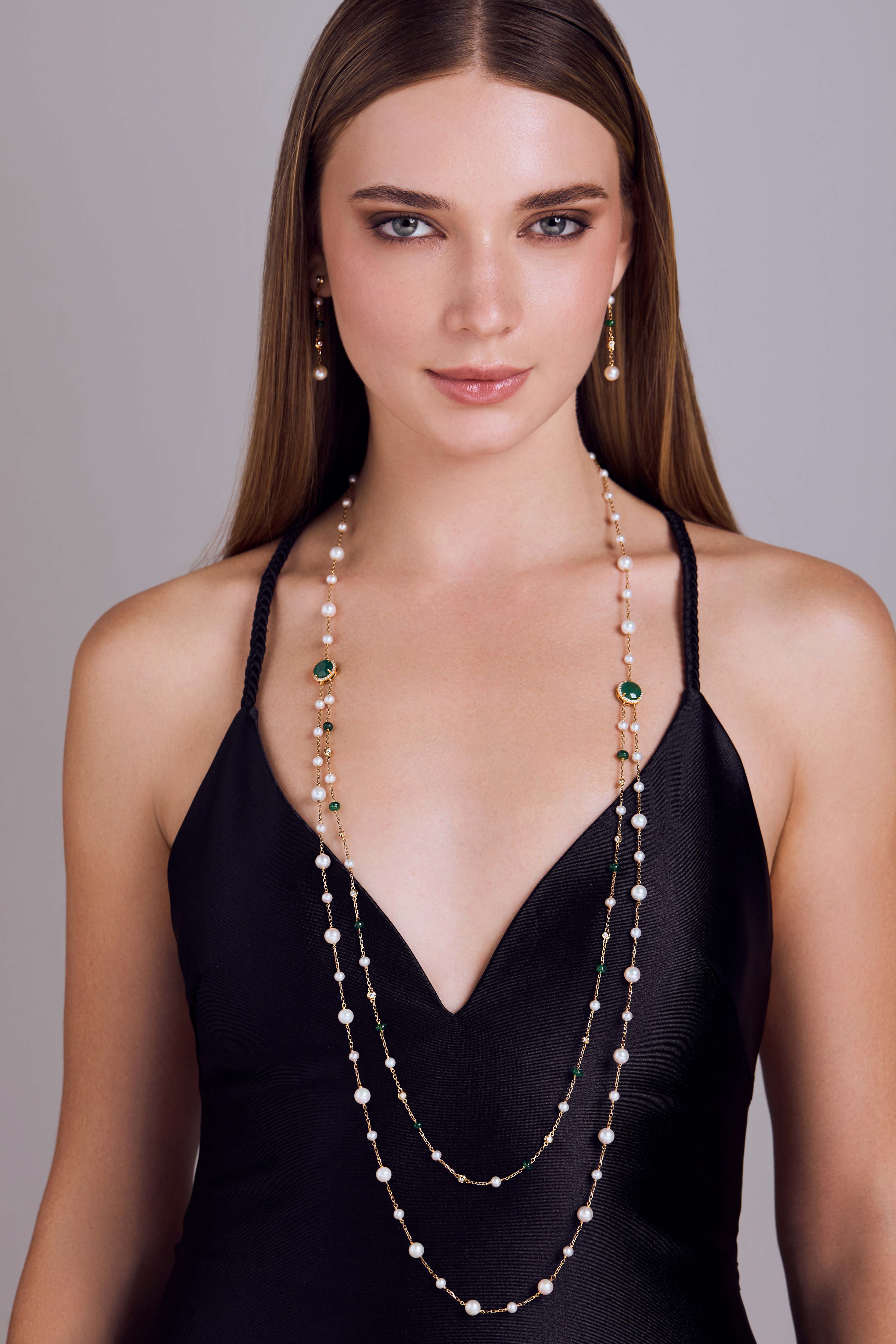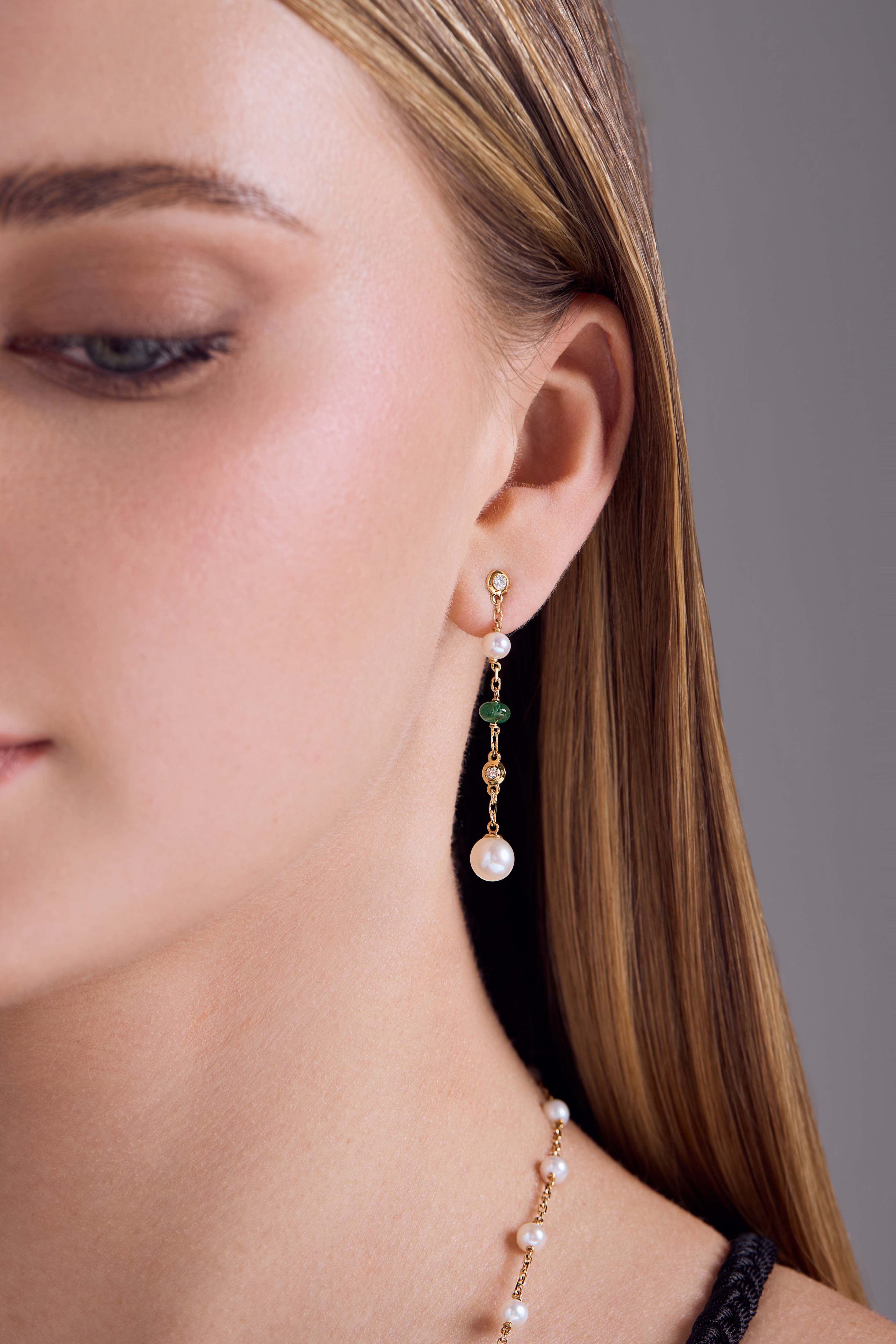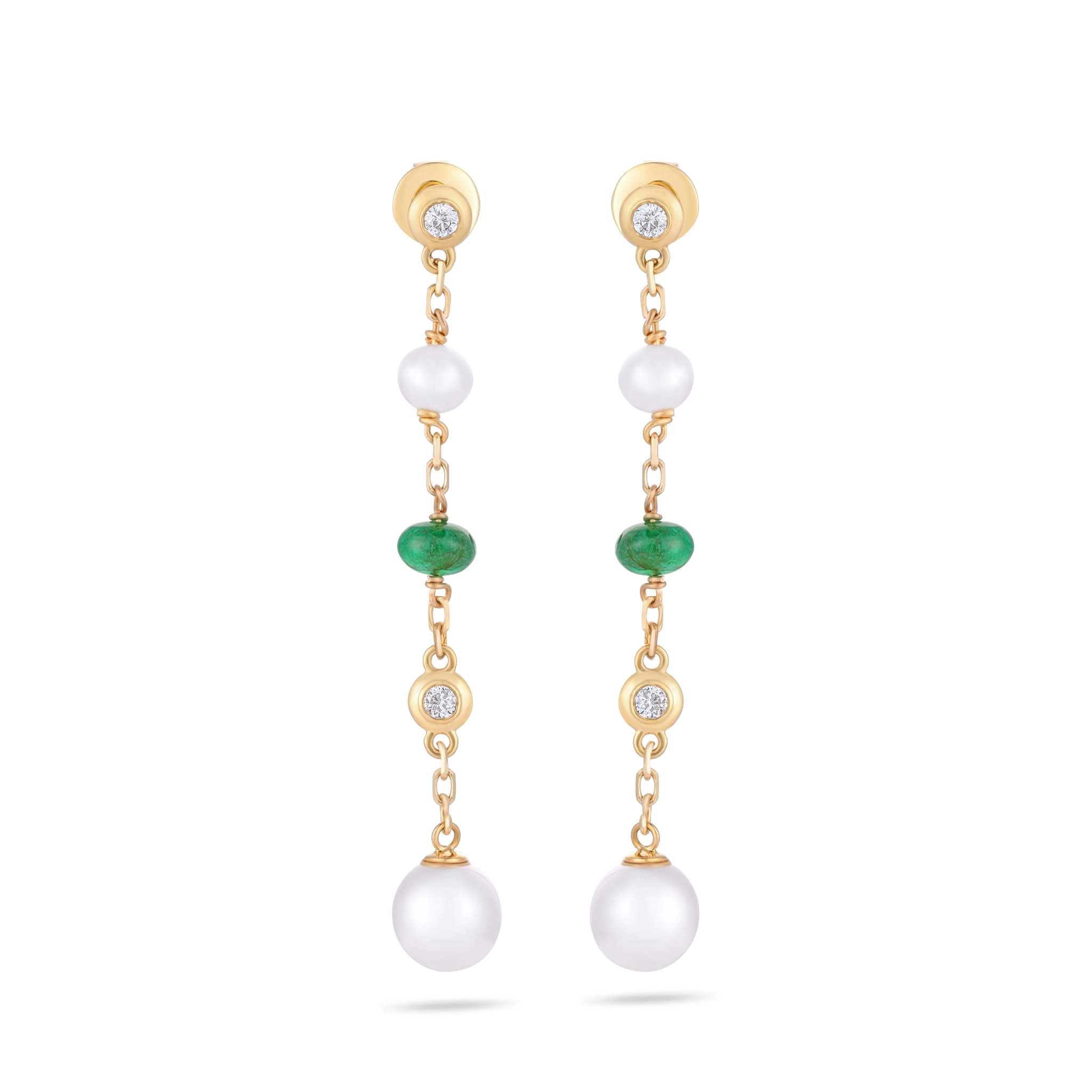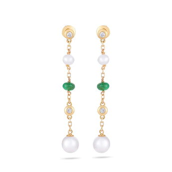 18K yellow gold long earrings made with diamonds, fresh water pearls and emerald beads.