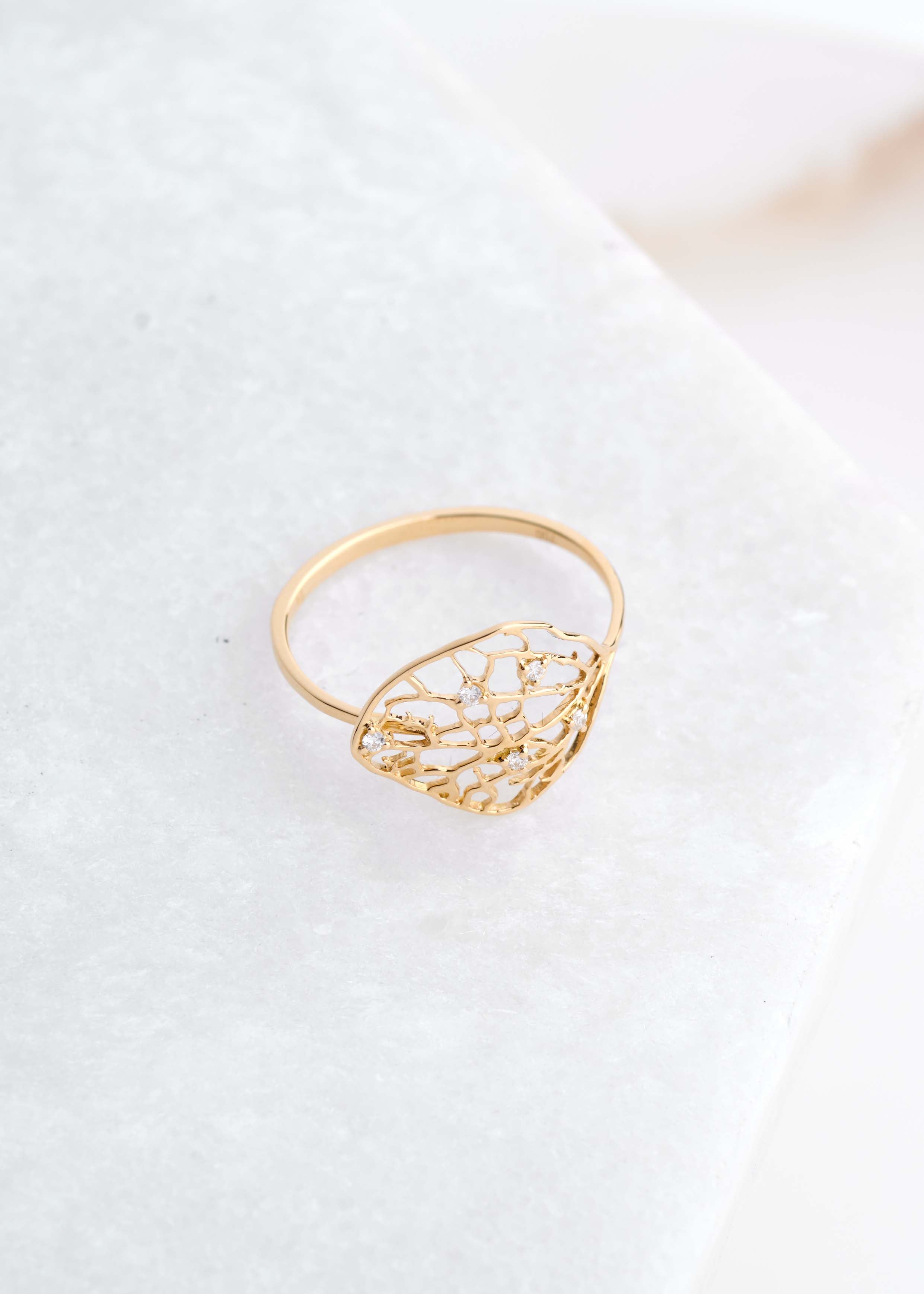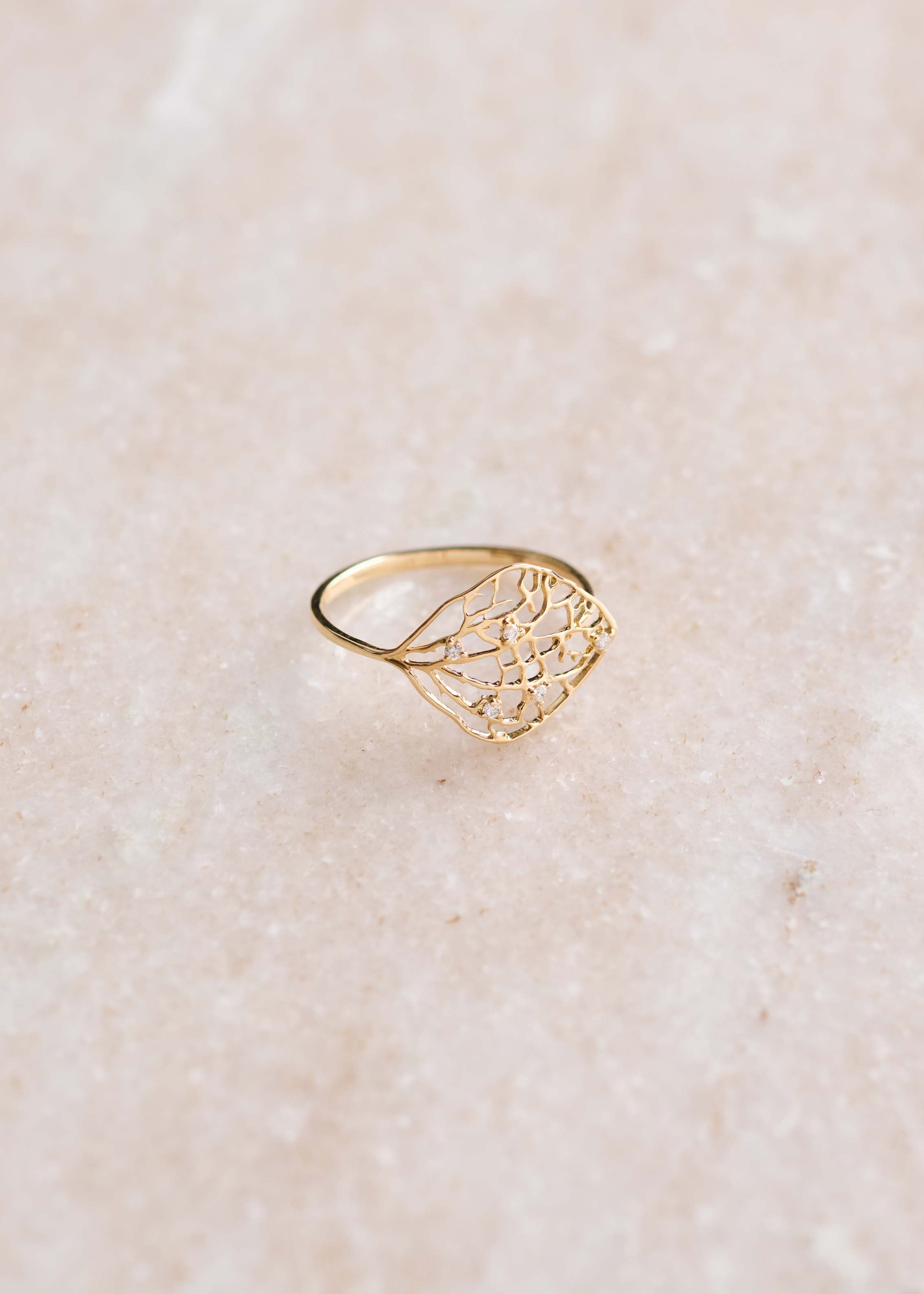 18K yellow gold dried leaf ring with round diamonds.