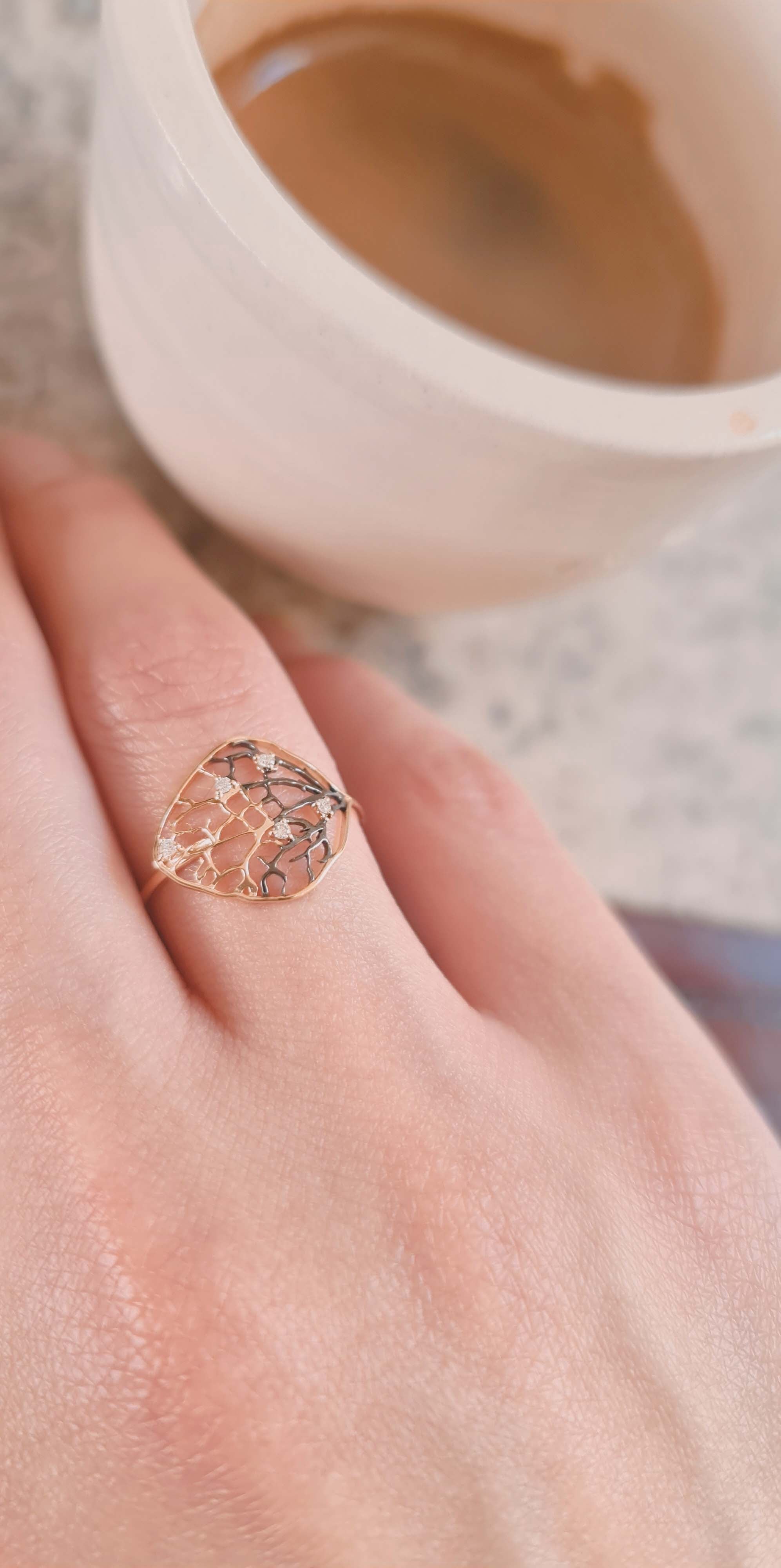 This ring is designed to represent a dried leaf with dew drops as diamonds.