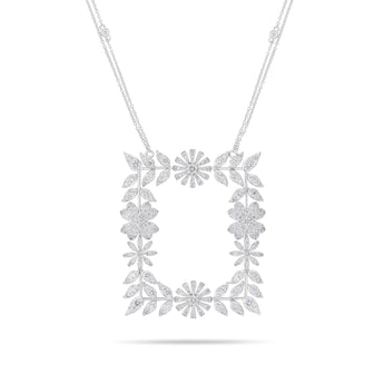 Step into a Winter dream with this long chain 18K white gold and diamond frame necklace that is adorned with Winter flowers and leaves that are made to look as if they have been gently frozen during Winter giving the necklace a frosted appearance and capturing the serene beauty of Winter. The flowers featured are the Winter Daisy, Primrose and Jasmine flowers.
