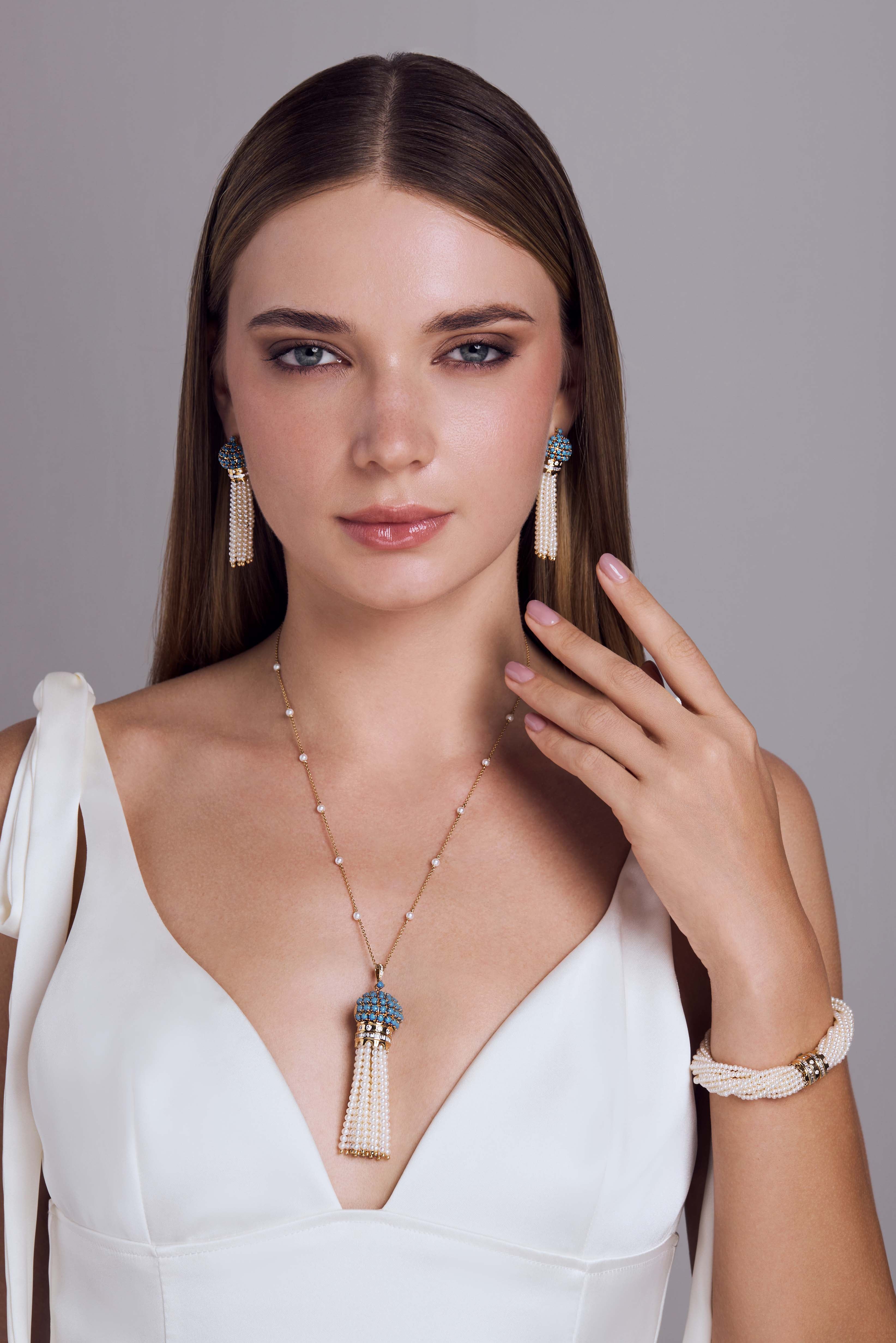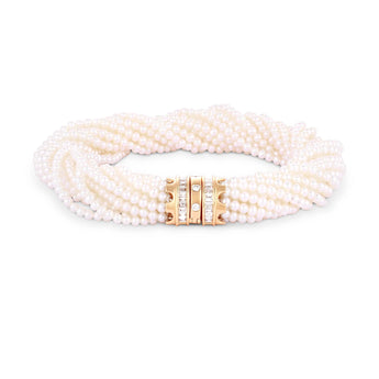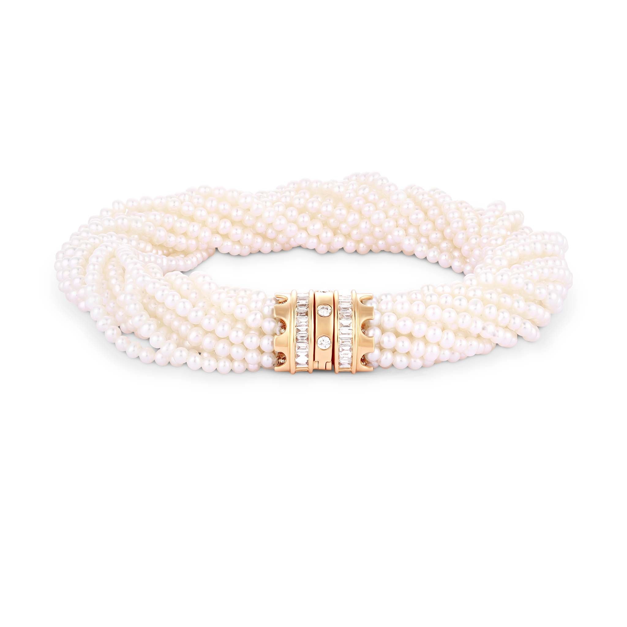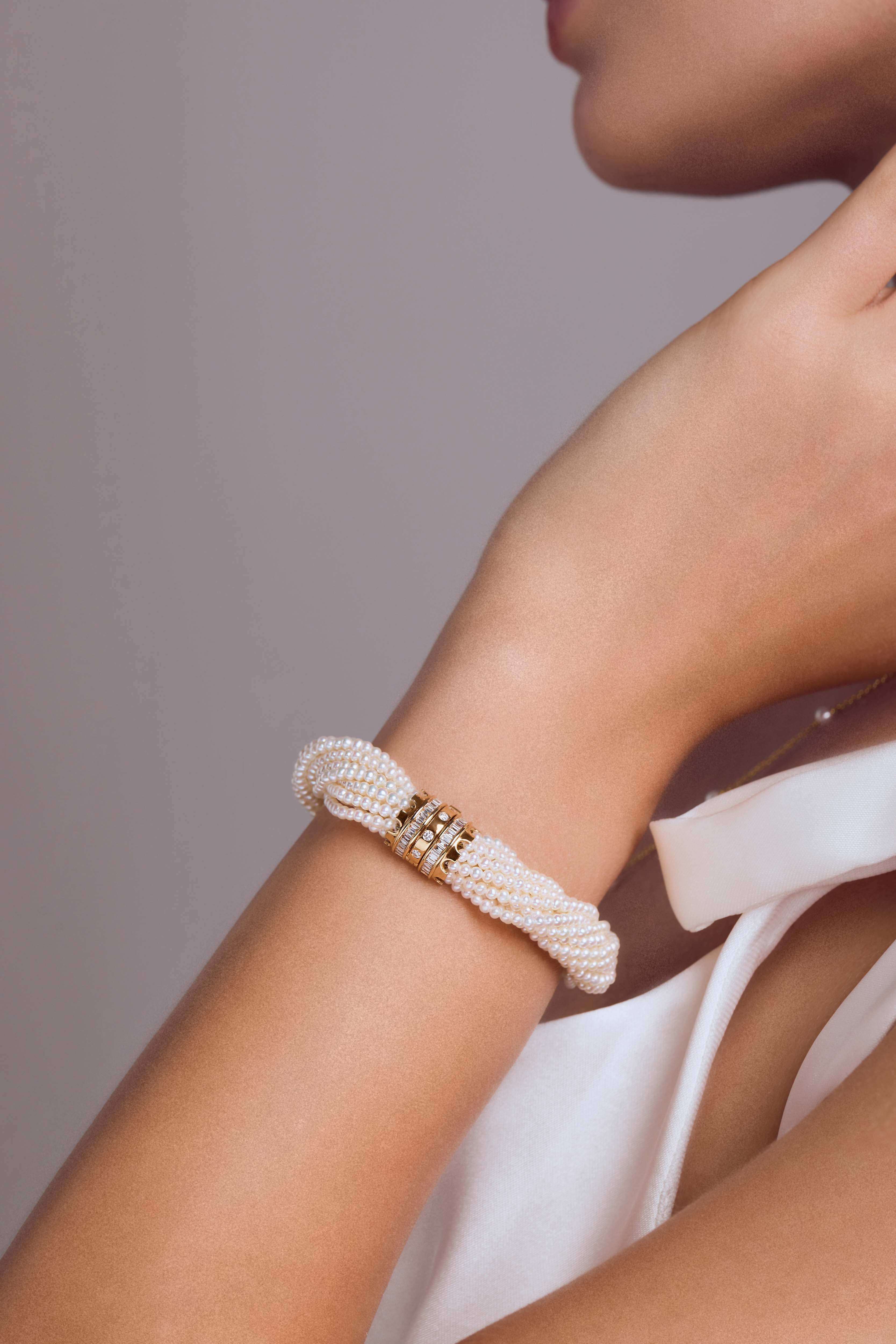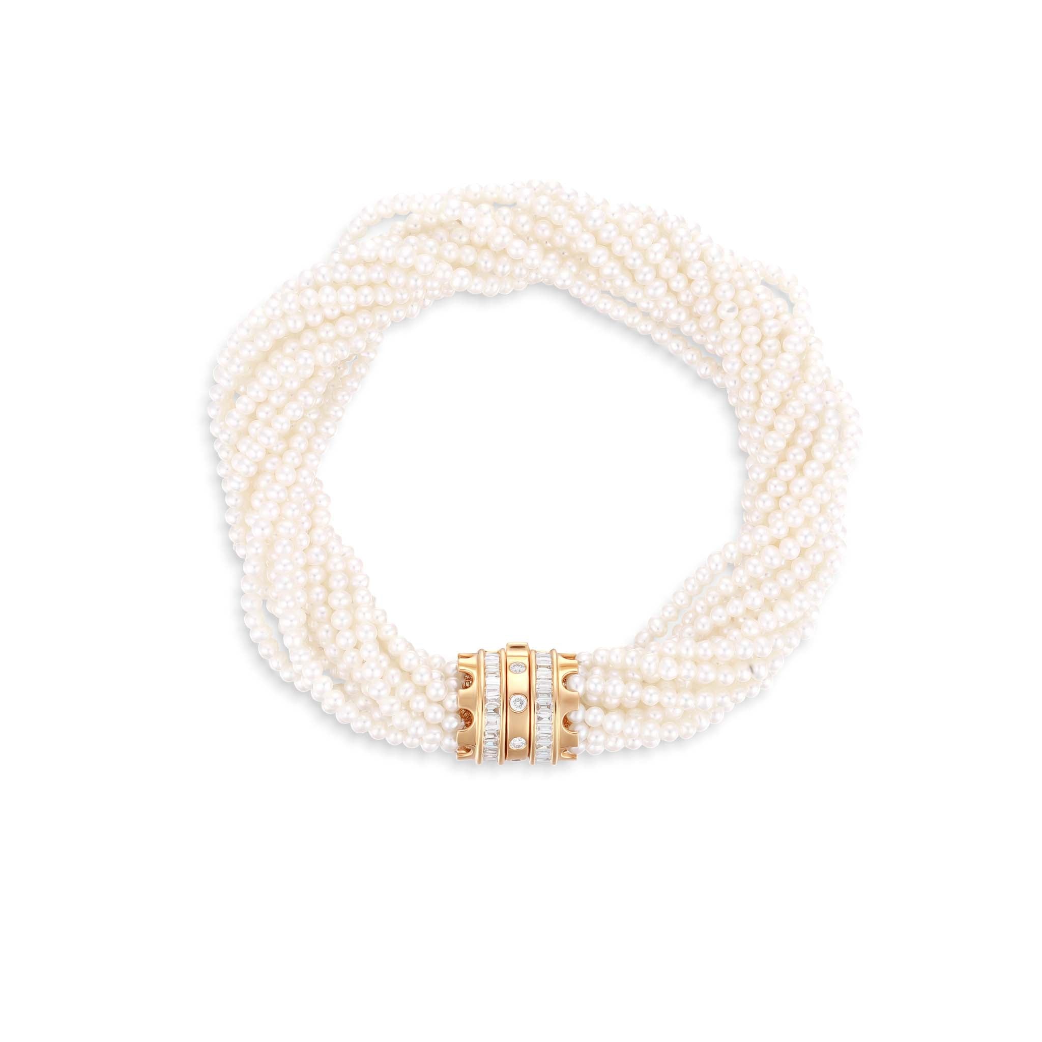 Bracelet made with 18K yellow gold, fresh water pearls, round diamonds and baguette diamonds.