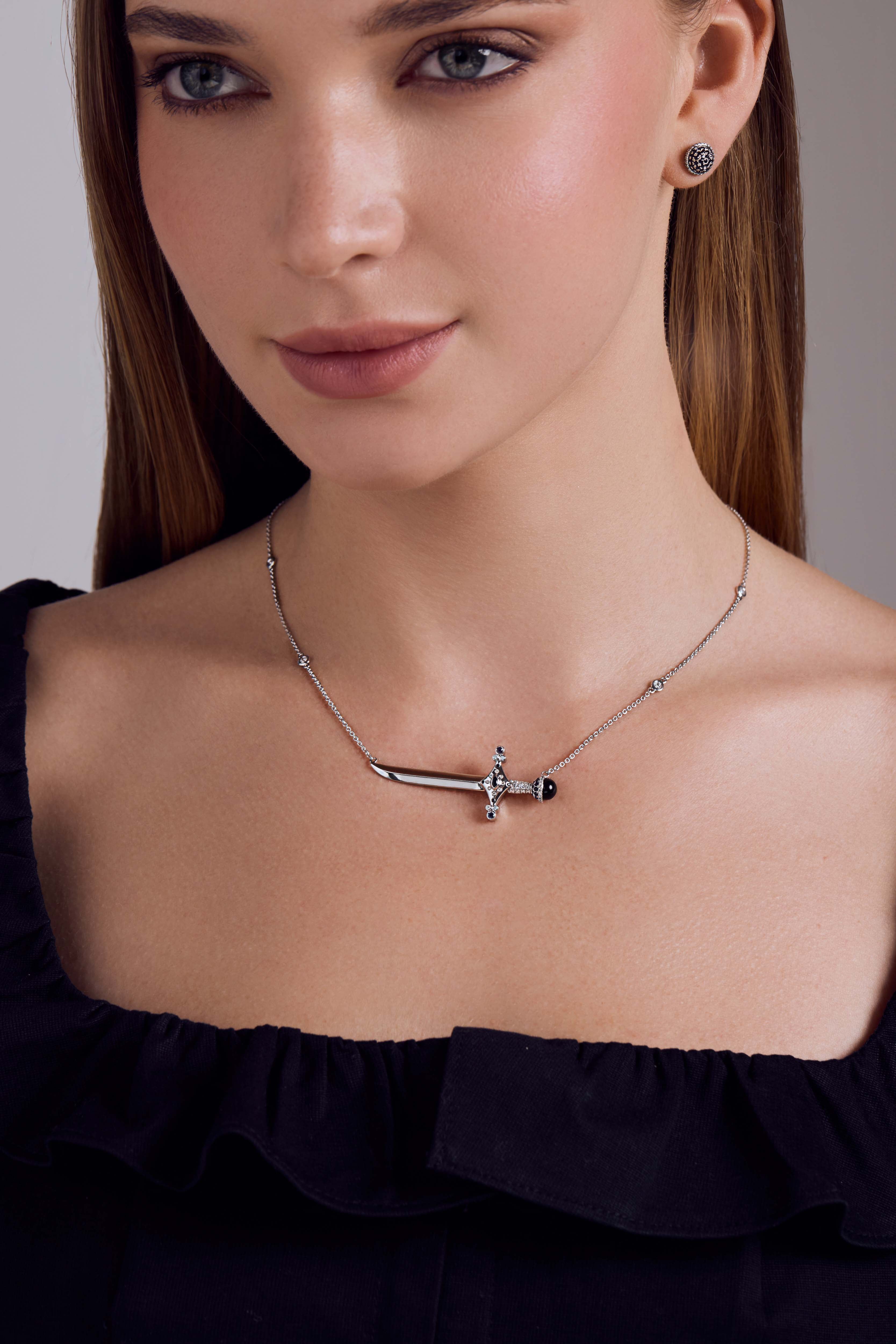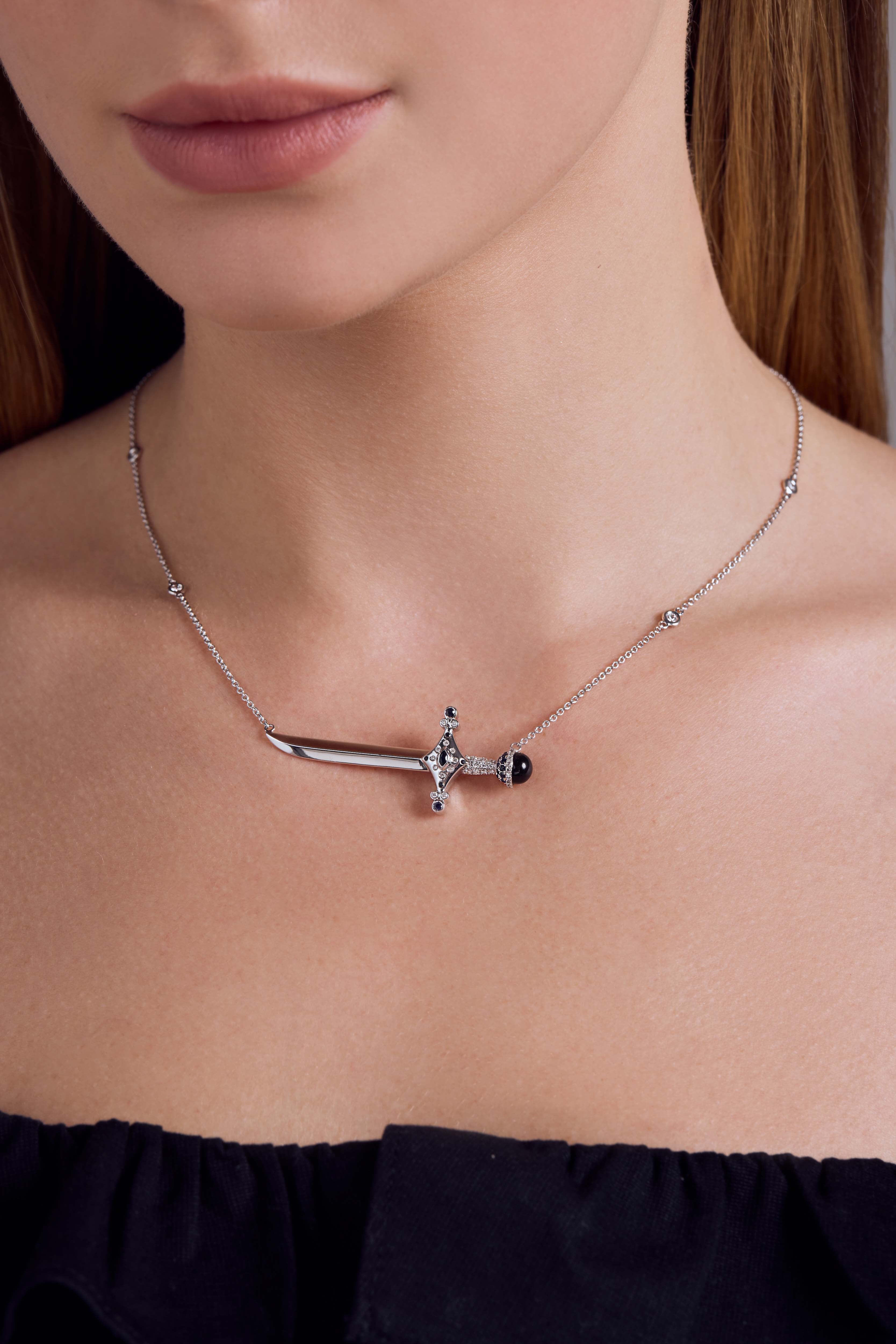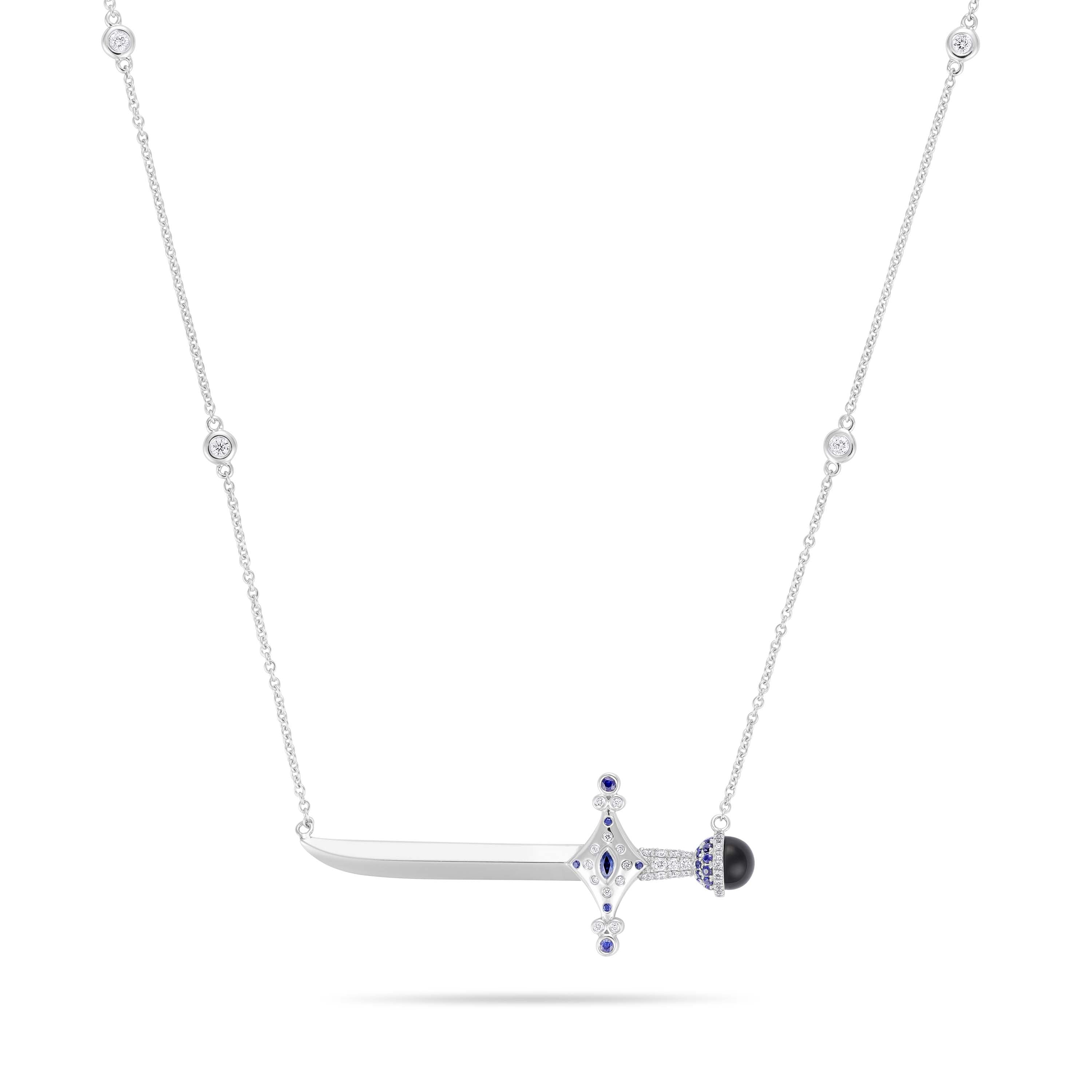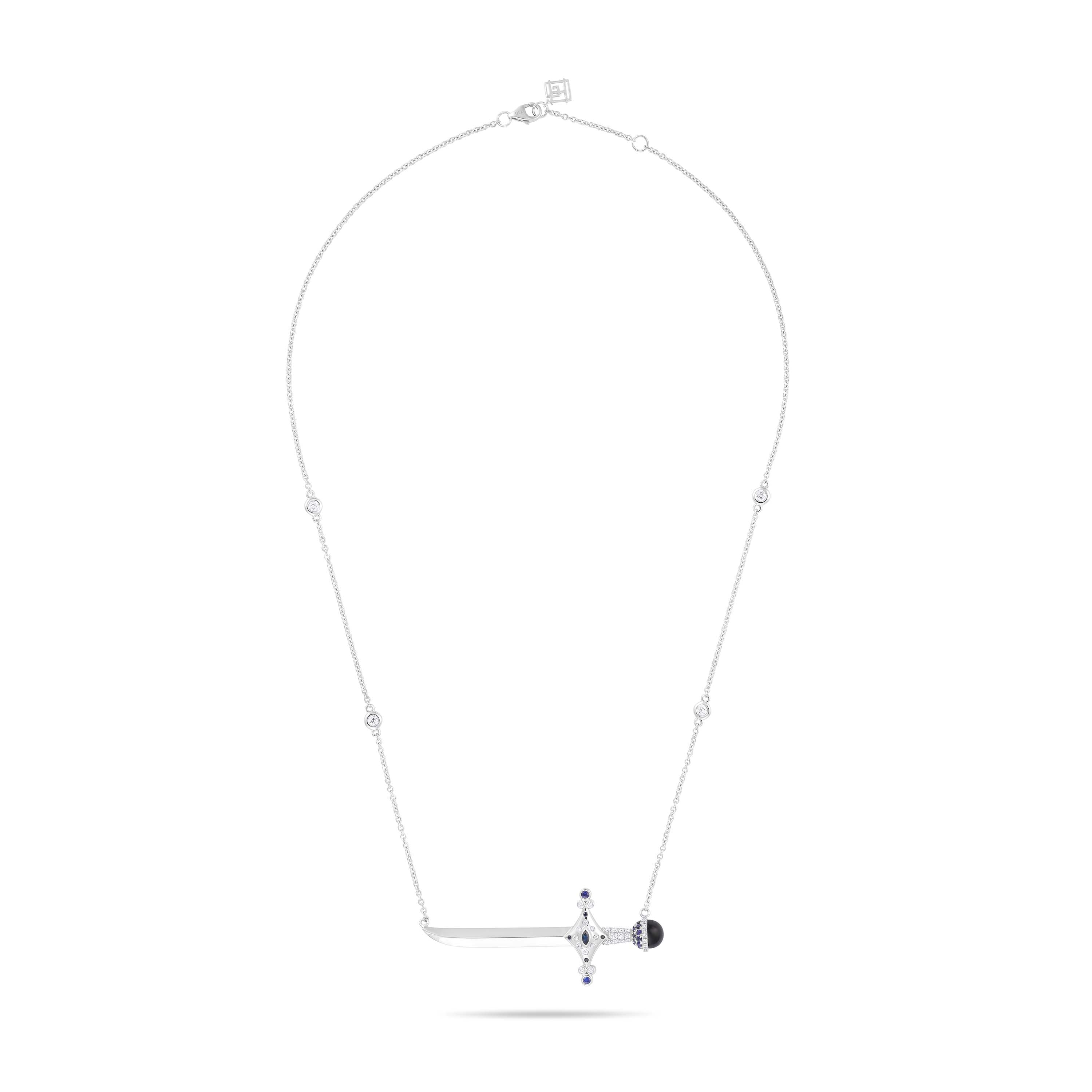18K white gold Arabian sword design necklace with blue sapphire, round diamonds and black onyx.